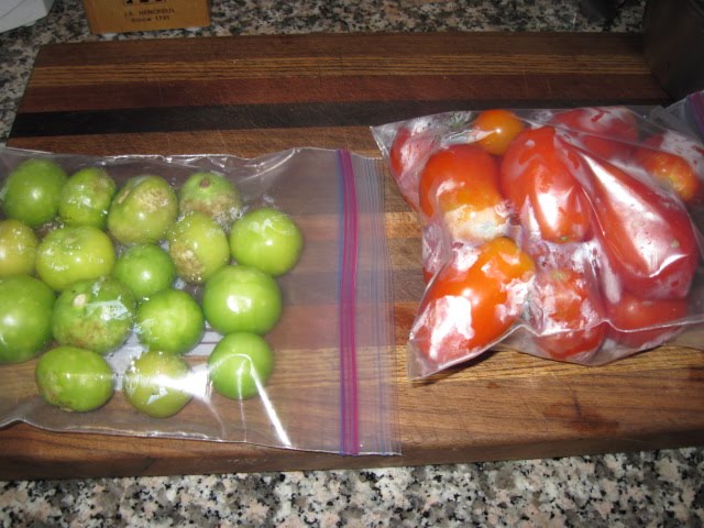 Tomatillos on left, plum tomatoes on right. Really easy to freeze, just wash and pop into bags. When you are ready to use the tomatoes, just run under cool water and the skins slip right off.